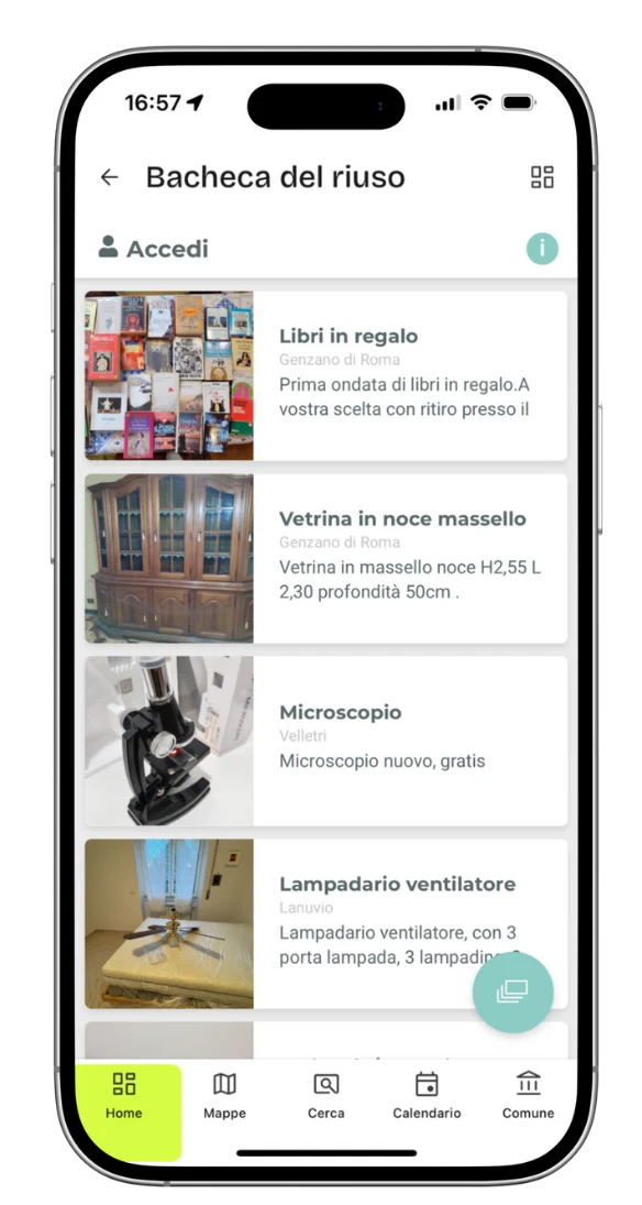 La Bacheca diventa così una vetrina virtuale, in cui tutti i soggetti coinvolti possono pubblicare annunci, di oggetti da avviare a riuso presenti nel centro stesso. Tutti possono mettere annunci su varie tipologie di oggetti che non usano più (dagli elettrodomestici alle apparecchiature ad articoli di collezionismo), consultabili da altri concittadini. Questi ultimi potranno manifestare interesse ad averli e organizzare con l’inserzionista la consegna. Ogni utente dell’app può manifestare l’interesse per un oggetto, lasciando le proprie info di contatto, e l’accordo proseguirà privatamente.