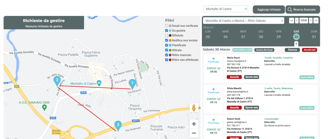 I ritiri dei rifiuti vengono organizzati automaticamente dal sistema in base alle zone e ai mezzi disponibili, con l’obiettivo di ottimizzare i tempi e le risorse